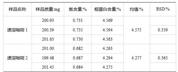 另外使用D100杜马斯定氮仪测试速溶咖啡中的粗蛋白含量精密度符合《GB 5009.5-2016 食品安全国家标准 食品中蛋白质的测定》中规定的两次独立测定结果的绝对差值不超过算术平均值的10%的要求,且RSD值为0.359%和0.365%,重复性良好。