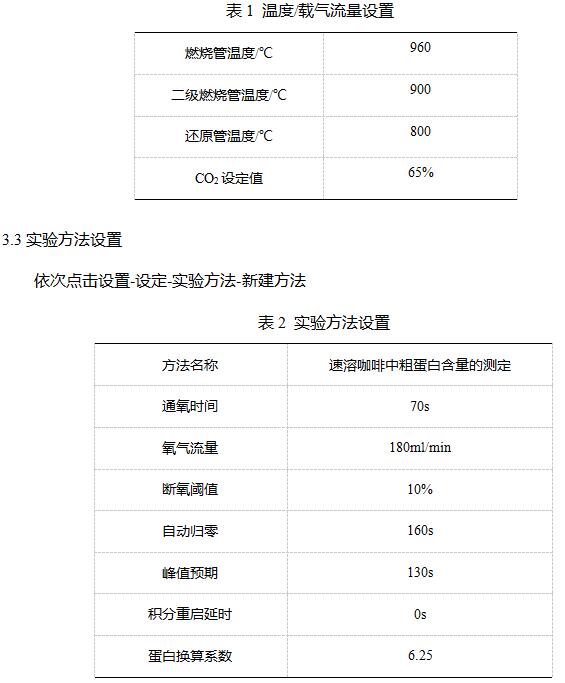速溶咖啡是通过将咖啡萃取液中的水分蒸发而获得的干燥的咖啡提取物。其配料表中明确表示其中添加有酪蛋白,酪蛋白是哺乳动物包括母牛,羊和人奶中的主要蛋白质,其在速溶咖啡中主要起到增稠、溶解、增白及中和等作用。因此本实验采用杜马斯燃烧法使速溶咖啡在高纯氧气中燃烧释放出氮,参照《GB 28050-2011 食品安全国家标准 预包装食品营养标签通则》和《GB 5009.5 食品安全国家标准 食品中蛋白质的测定》,使用杜马斯定氮仪对速溶咖啡中的蛋白质进行定量测定。