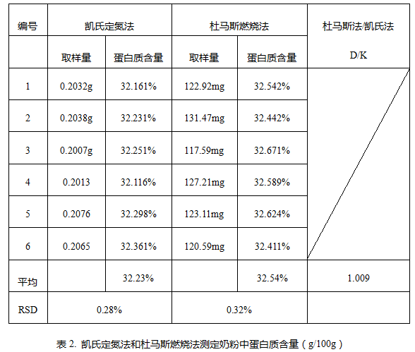 凯氏定氮法和杜马斯燃烧法测定奶粉中蛋白质含量的比较