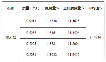 以上数据显示,使用K1100F凯氏定氮仪测定黑木耳中的蛋白质含量符合《GBT6192-2008 黑木耳》中粗蛋白大于7%的要求,所得结果误差均在允许范围之内。