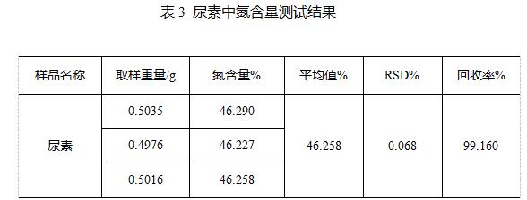 测试结果显示本次测试的氮含量均值为46.258%,回收率为99.160%。且重复性满足《GB/T 2441.1-2008 尿素的测定方法 第1部分:总氮含量》中平行测试结果绝对差值不大于0.1%的要求。