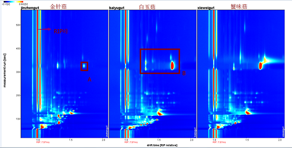 图1.金针菇、白玉菇及蟹味菇的气相离子迁移谱图