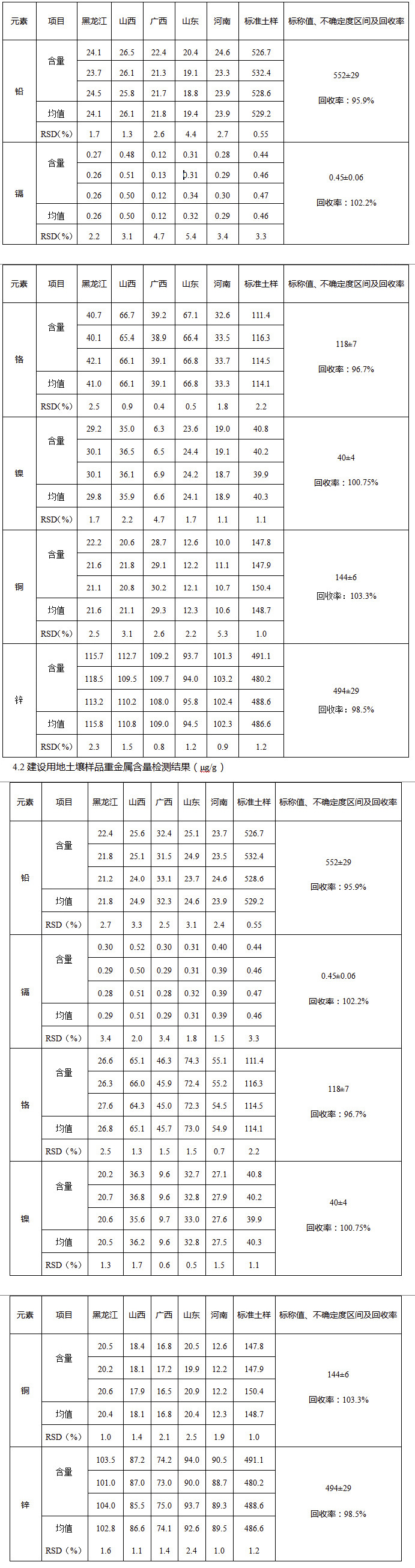 检测结果表明,不同地区土壤样品中的金属元素含量存在差异,相同地区不同类型土壤中的金属元素也存在较大差异;三次取样的检测结果平行性良好,标准样品的实测值也在标称值的不确定度区间之内,元素回收率95%~103%,检测结果精密度和准确度令人满意,说明该微波消解方法适用于土壤重金属检测的前处理工作。