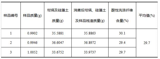 《NY/T 1459-2007 饲料中酸性洗涤纤维的测定》中对于重复性规定:酸性洗涤纤维(ADF)含量≦10%,允许相对偏差≦5%;酸性洗涤纤维(ADF)含量>10%,允许相对偏差≦3%。实验各样品三次独立测定结果相对偏差均小于3%,符合标准要求。