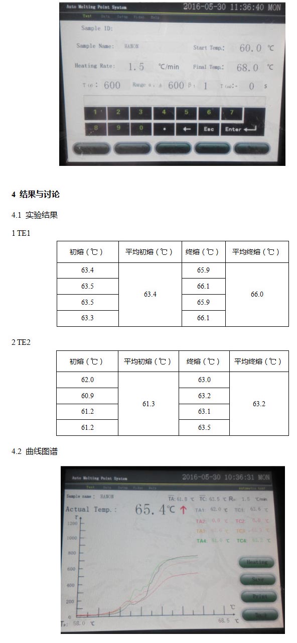 两个样品均测试过三次,即12个样品,取平均值得出熔点值,由于样品熔点较低,测试之前并未进行样品预干燥处理,建议设置50℃预干燥1-2h后进行测试,效果更佳。