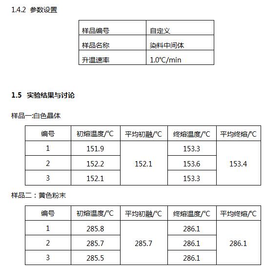 1.4.1 测定方法:将样品在烘箱内以适合的温度烘至恒重,将其装入毛细管中,高度约3-5mm左右,注意装样时需均匀、颠实、所装样品的高度最好保持一致。设置仪器参数后进行实验,记录结果。