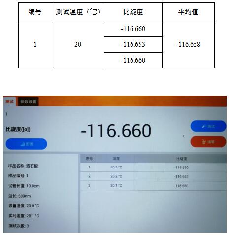 仪器预热,设置合适的参数用,在20℃时,用空白溶液校正后,测试样品的比旋光度,重复测定3次并记录数据。