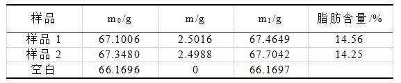 2.取样:精确称取样品约2.5g左右(记为m),放入研钵中将其研碎,并用脱脂棉将研钵上残留脂肪用乙醇擦拭干净,一并放入滤纸筒内,并覆盖上一层脱脂棉,放入80℃烘箱烘干1h。