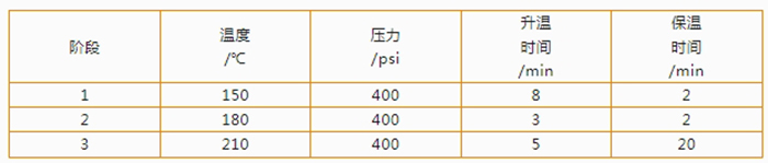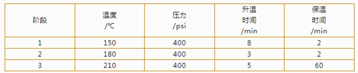 分别加入 6 mL硝酸、2 mL盐酸和3 mL氢氟酸,同时做试剂空白,待全部加完后缓慢摇晃消解罐,保证样品都浸没在酸液里。室温静置10min,待其反应完全后,组装消解罐,按照如下设置参数进行消解: