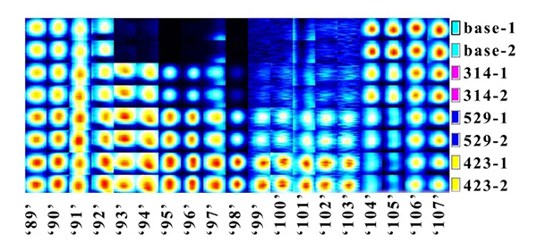 通过GC-IMS对纯花生油(PO)和掺杂菜籽油(RO)花生油的挥发性成分进行比较,呈现了200多个单独的信号(图1)。因此,可以根据非靶向分析方法来区分油,结果显示了样品之间的差异,在信号强度和性质方面的显着变化证明了这一点。在 100 ~ 300 s的时间内,不同(RO)比例的(PO)的差异最为显著。特别是,在花生油(PO)中未检测到编号为95-98标识符,而随着(RO)与 (PO)混合比例的增加,它们的信号增加 。