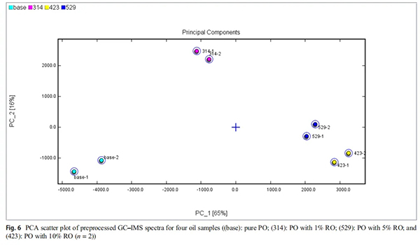 GC-IMS为纯花生油(PO)中菜籽油(RO)的快速检测提供了合适的方法。化合物指纹图谱可以可靠地区分不同成分的花生油,(RO)最低为 5%。用GC-IMS获得的图谱成功地证明了芳香花生油和芳香菜籽油之间的差异,并且不需要对这两种食用油中存在的挥发性有机化合物进行单独鉴定。